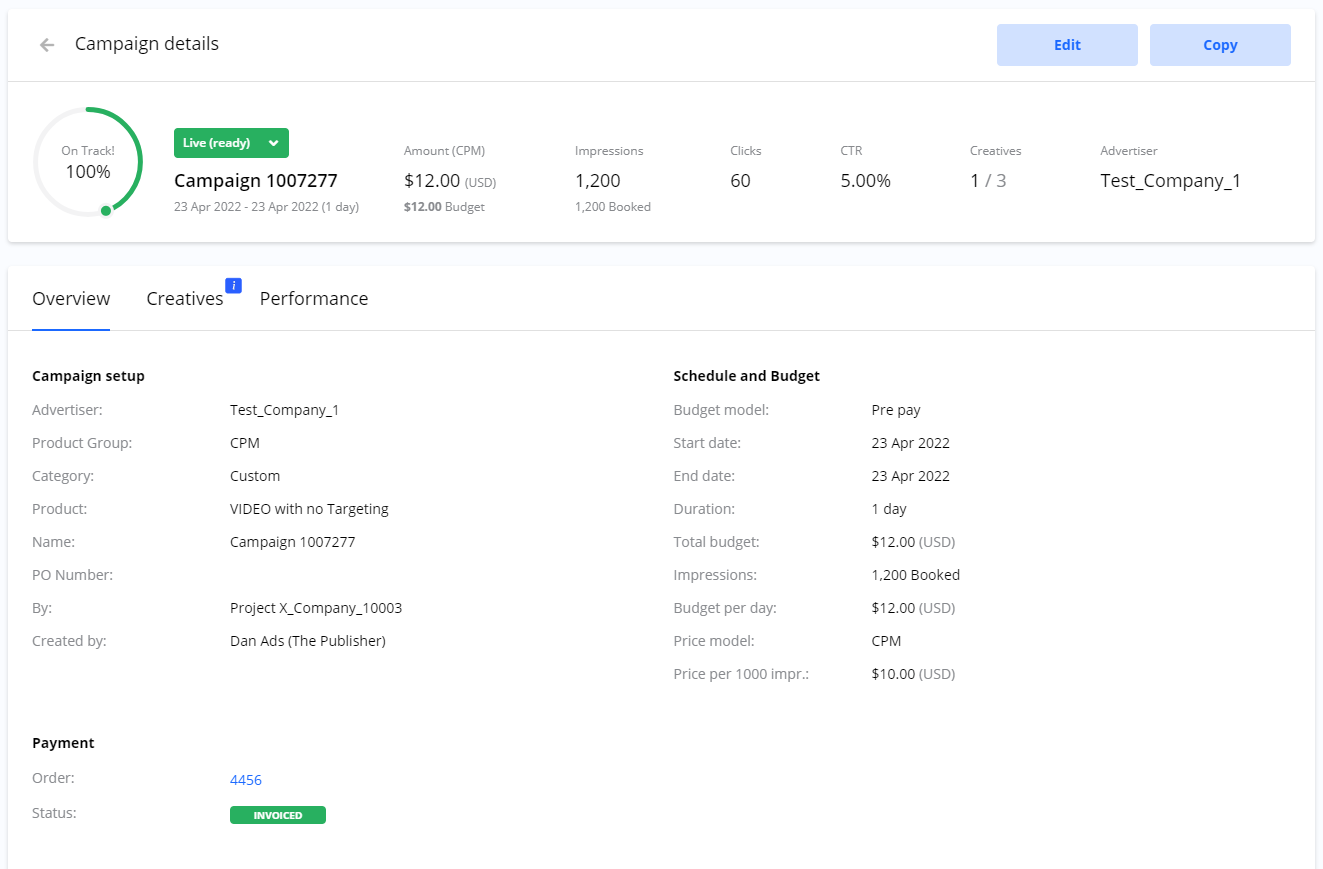 On this page you will see all details of Campaign setup, Schedule and Budget, Targeting and Payment.