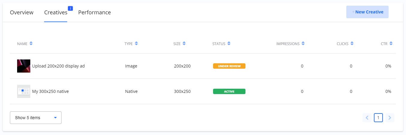 Under the Creatives tab you will see all Creatives under this Campaign, and their statuses.