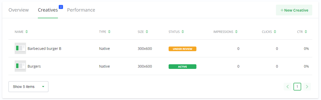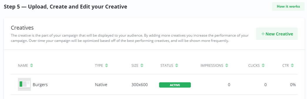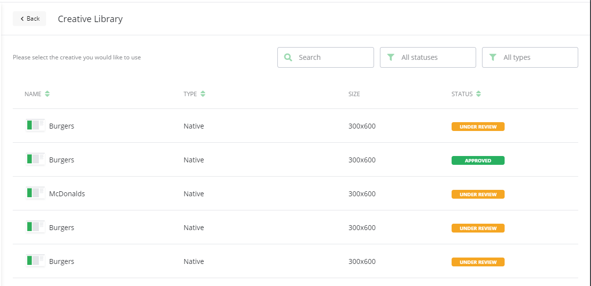 Through the Creative library you can add already approved Creatives. When you do the same Creative will be running on multiple Campaigns simultaneously. This saves time and allows for more efficient handling of Creatives.