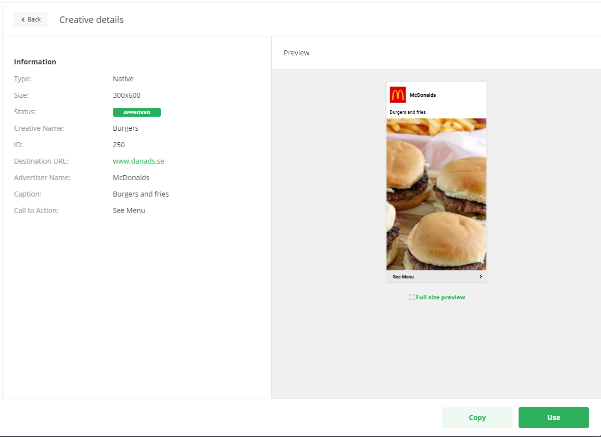 Select a Creative with status Approved. The Creative details screen is opened.