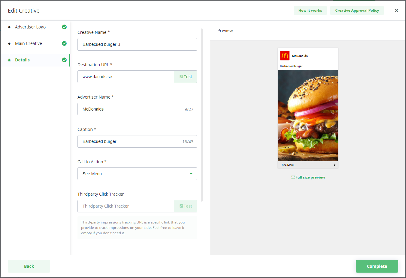 Select any Creative. The Creative details screen is opened.