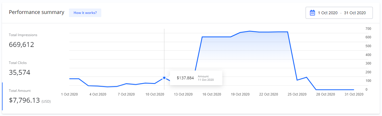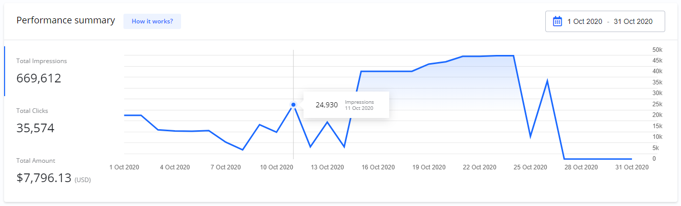 When your Campaign is live, your ad is shown to the targeted audiences. Statistics how many times your ads are shown (impressions), clicks, views, completions, etc. are collected daily.