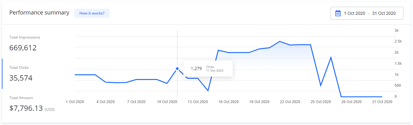 On your Dashboard > Performance summary you get an overview of total statistics for all your Campaigns.