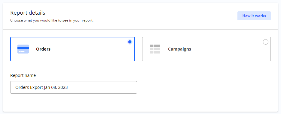 Reports show details and statistics for all your Campaigns and Orders.